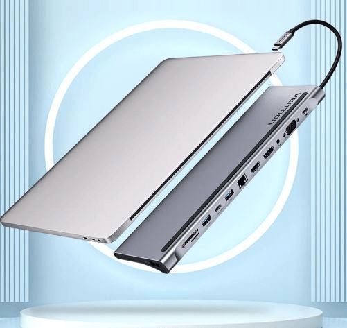 The Vention USB-C 12-in-1 Docking Station is a feature-rich, all-in-one USB-C hub designed to handle demanding connectivity needs. It includes DisplayPort, HDMI, VGA, USB-C Gen 1, USB 3.0 (2x), USB 2.0, RJ45 Ethernet, SD/TF card slots, a 3.5mm audio jack, and PD fast charging — all built into a sturdy gray aluminum alloy enclosure. Perfect for users who want full flexibility from a single USB-C connection.