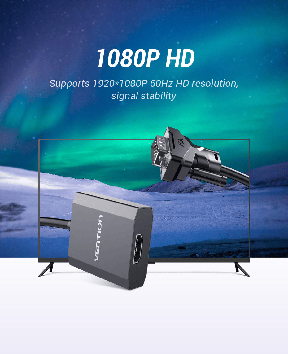 The Vention VGA to HDMI Converter is a video signal converter designed to upgrade VGA output devices by allowing connection to modern HDMI displays. It features a Micro USB power input and a 3.5mm audio jack for complete audio-video transmission. Housed in a durable black metal shell, this 0.15-meter Vention AV converter delivers stable Full HD output while offering superior heat resistance and long-term durability.